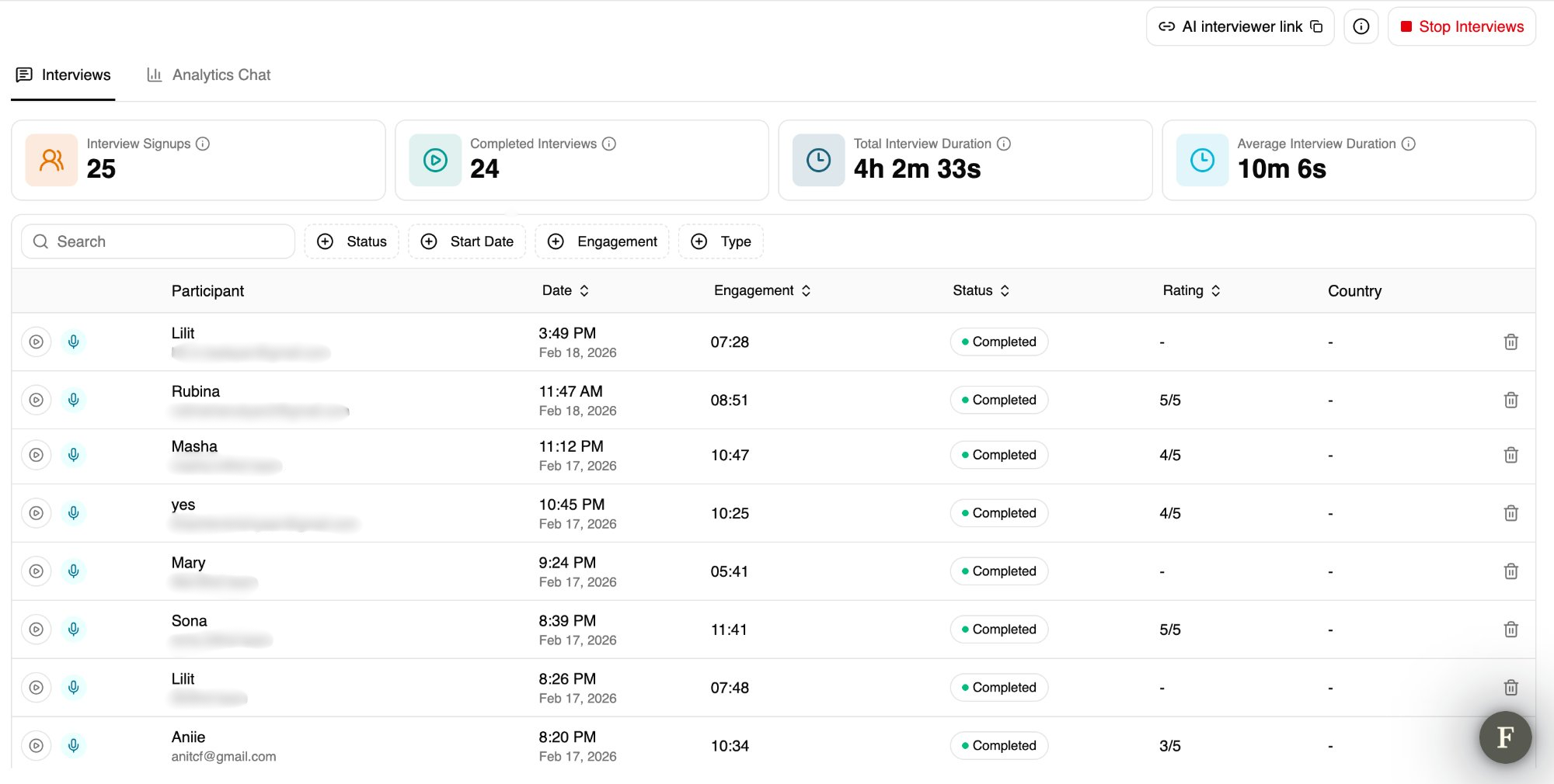Once interviews start coming in, you get clear takeaways, patterns, and opportunities not raw data to sift through.